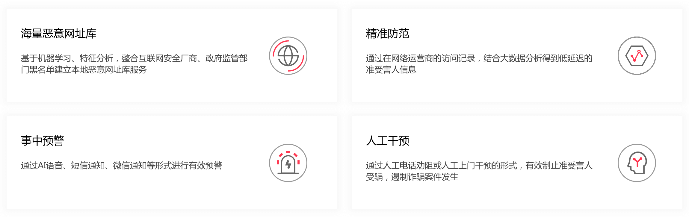 “道高三丈”易感人群预警劝阻SaaS服务平台是一个通过大数据分析对访问 “杀猪盘”、虚假贷款网站(APP)等的疑似受害用户进行事中预警的服务平台。该平台根据不同诈骗类案特点,构建数据特征仓库,通过在网络运营商的访问记录,结合大数据分析得到低延迟的准受害人信息,通过AI语音、人工电话劝阻或上门干预的形式进行有效预警,及时制止准受害人向嫌疑人转账,遏制诈骗案件发生。